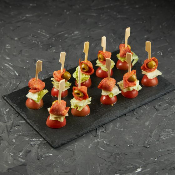 Состав: хлеб бородинский, колбаса пепперони, огурец, сыр плавленный, маслины