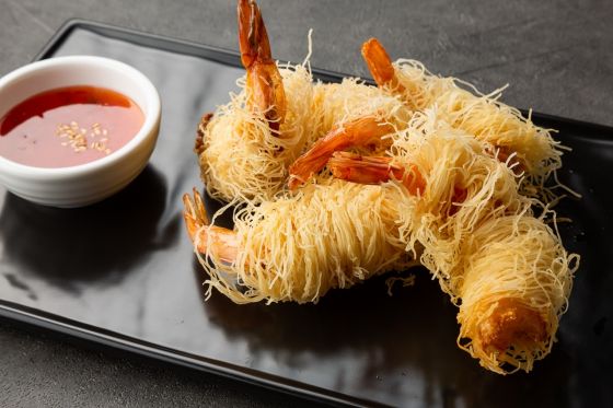 Креветка в тесте катаифи с освежающим тропическим соусом 50 гр.