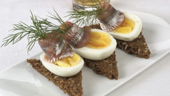 МИНИ БУТЕРБРОД ИЗ РЖАНОГО ХЛЕБА С СЕЛЬДЬЮ, ЖЕМЧУЖНЫМ ЛУКОМ И ПЕРЕПЕЛИНЫМ ЯЙЦОМ