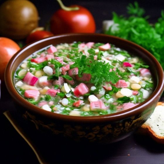 Состав: квас, говядина, редис, огурец, укроп, лук зеленый, специи, яйцо, картофель, сметана, хрен, горчица