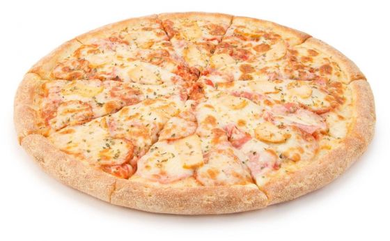 Состав: ветчина, филе куриное, томаты черри, сыры моцарелла и чеддер, пицца соус