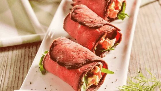РУЛЕТИК С ГОВЯДИНОЙ, СЫРНЫМ МУССОМ И СЛАДКИМ ПЕРЦЕМ