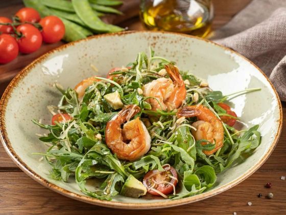 САЛАТ ГАМБЕРРИ С РУККОЛОЙ, АВОКАДО И КРЕВЕТКАМИ