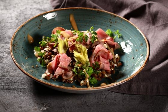 САЛАТ С РОСТБИФОМ И СВЕЖИМИ ОВОЩАМИ ПОД КРОШКОЙ ПАРМЕЗАНА