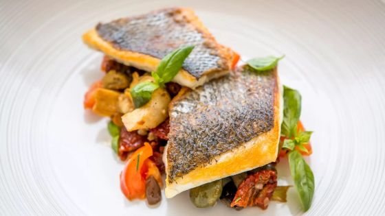 Состав: сибас, томаты вяленные, специи, зелень, лимон, соус тар-тар