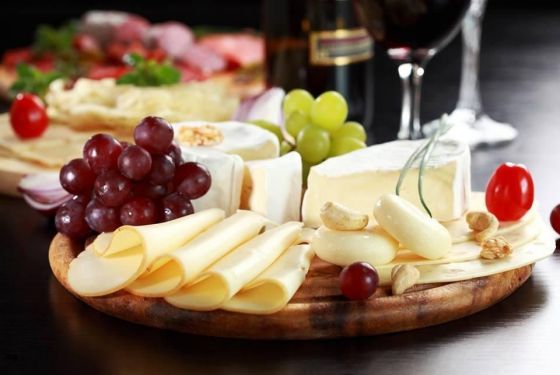 Состав: маасдам, бри, чеддер, дор блю, пармезан, мед, виноград, крекер, палочки гриссини, клубника, голубика, грецкий орех, мята