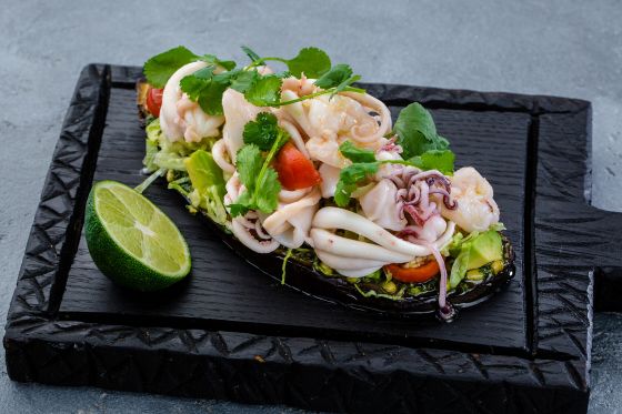 Кальмары, огурцы свежие, картофель, лук зеленый, яйцо, майонез 180 гр.