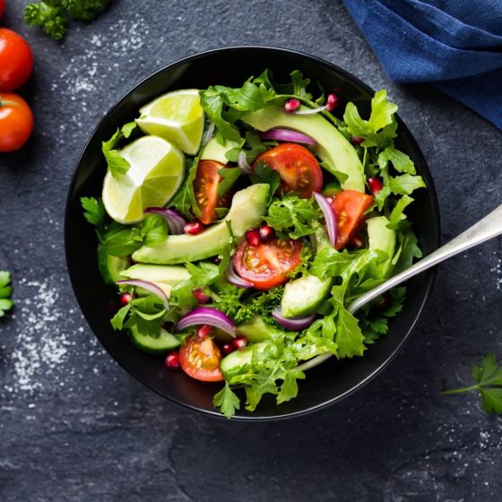 Легкий салат со спелым авокадо, сыром Фета, красным луком и огурцами, помидорами черри 90 гр.
