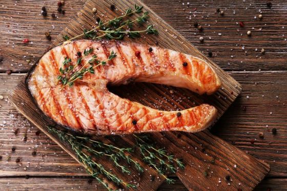 Стейк из лосося на картофельном пирожке, с маринованным редисом, микро-горошком на соусе овощное фондю;180/120/50 гр.