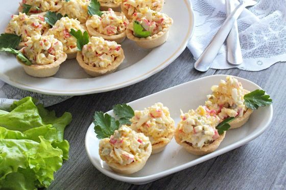 Состав: тарталетка, имитация краба, рис, кукуруза, яйцо, майонез, икра тобико