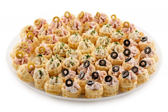 Воздушные волованы с муссами из ветчины, из коньячного сервелата и из курицы.