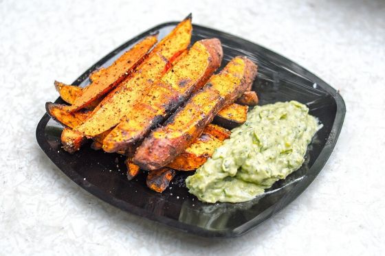 ЗАПЕЧЕННЫЙ БАТАТ С МОРЕПРОДУКТАМИ И СОУСОМ ГУАКАМОЛЕ